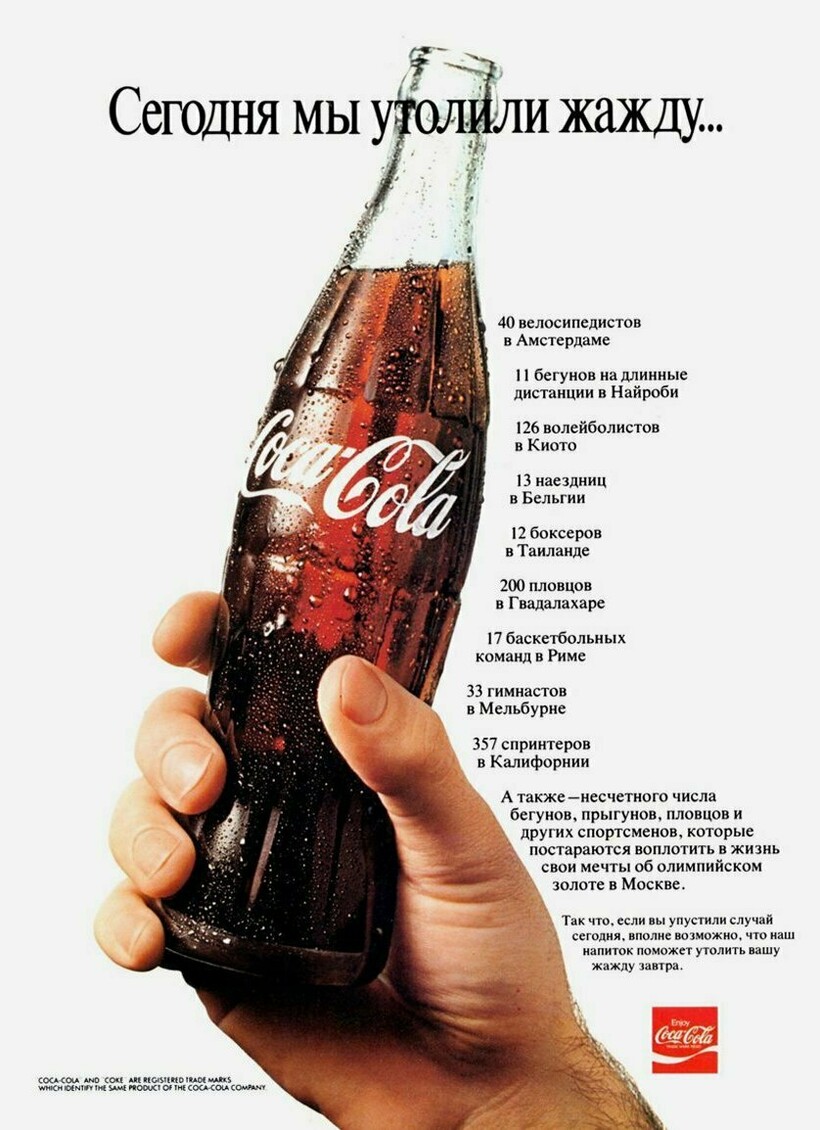 Мы рассказывали, что в Советском Союзе у рекламы была своя особенность: она рекламировала непосредственно новый товар. Конкуренции в стране не было, ведь не было большого количества предприятий, которые производили одинаковые предметы быта, продукты или услуги. Также в СССР (пусть и редко!) поступали товары из других стран. В особенности, поток импорта был налажен в преддверии Летних Олимпийских игр 1980 года. В основном в Советский Союз ввозили были автомобили, фототехника, газировка. Для них создавали свою рекламу, мы отыскали эти рекламные кампании.