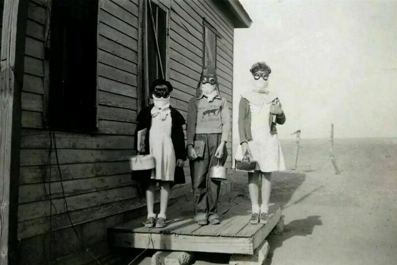 Американские дети собрались в школу во время пыльной бури, 1933