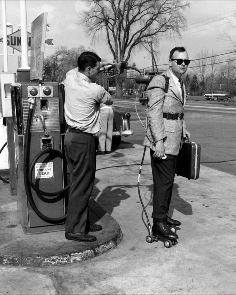 Мужчина заправляет свои самоходные коньки, 1950 гг.
