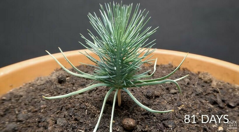Через две недели из земли проклюнулся росток. К 100 дню побег не помещался в кадр, и камеру пришлось отдалить от растения. К 300 дню росток уже напоминает миниатюрную сосну.