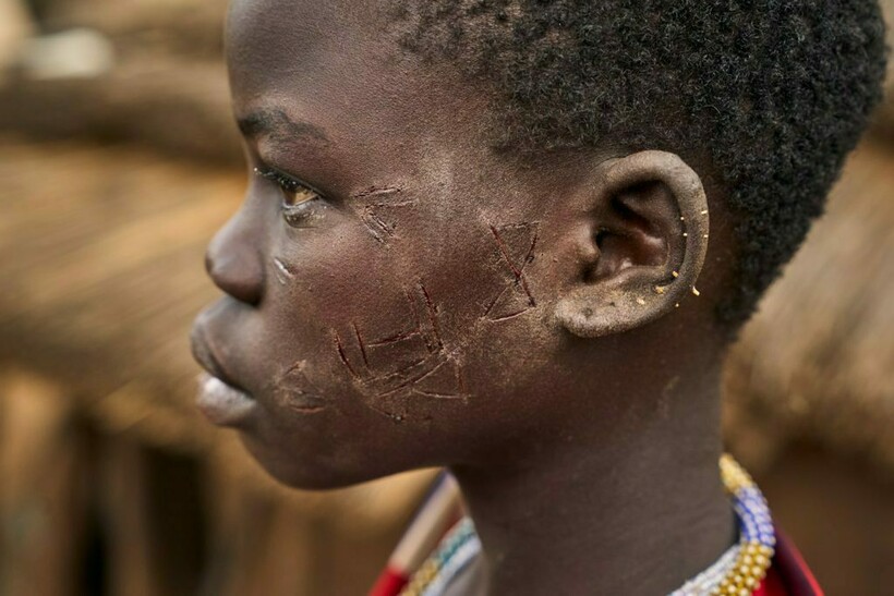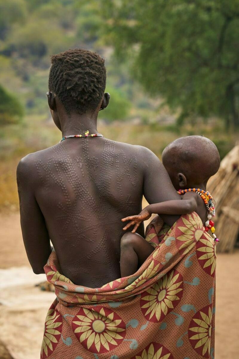 В будни на них обычно минимум одежды, однако всегда есть украшения: кольца в носу, серьги в ушах, а также бусы и ожерелья. Любовь к украшениям есть во многих племенах Африки: вот тут мы рассказывали, зачем женщины народа мурси вставляют себе в губу тарелку. Нам сложно понять такие традиции, но нечто подобное есть и у ларим: местные женщины украшают свое тело шрамами.