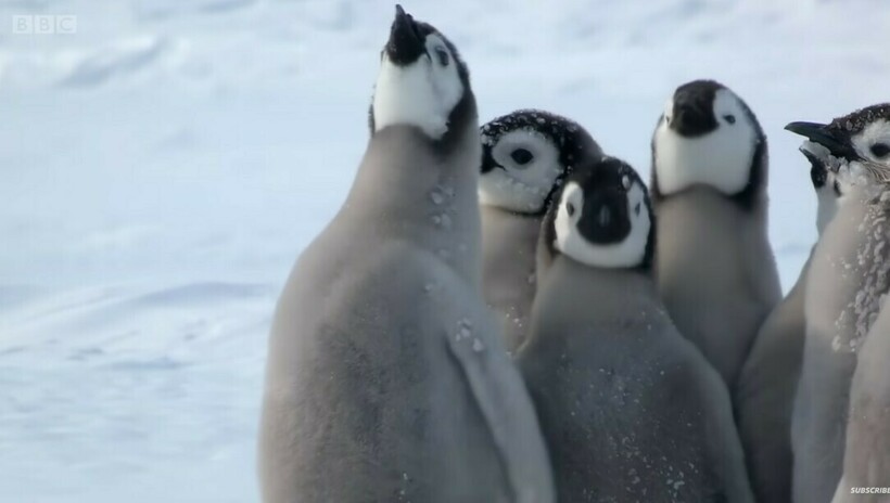 В ролике группа птенцов встречается с буревестником, который пытается на них напасть. Малыши выстроились в круг, чтоб защитить друг друга. Они хоть и выглядят как птенцы, но их рост уже около метра. Так что буревестнику непросто с ними справиться.