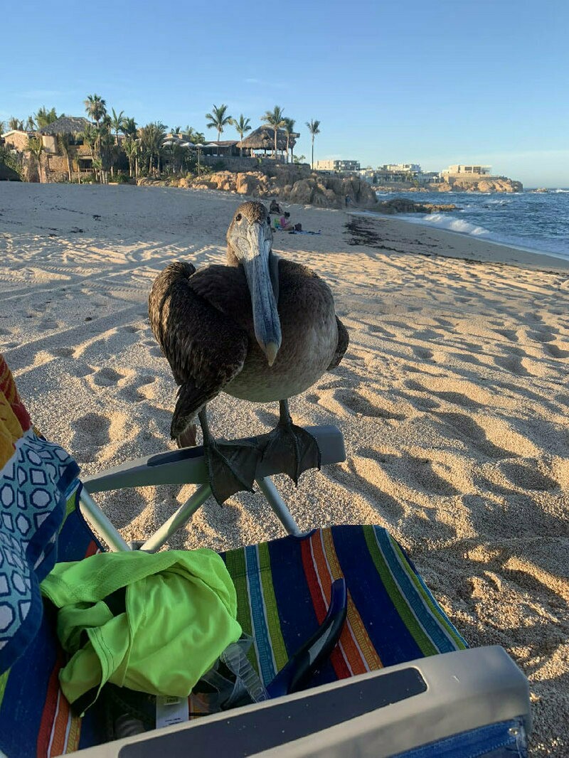 Пеликан три часа сидел на кресле, наблюдая как автор фото загорает