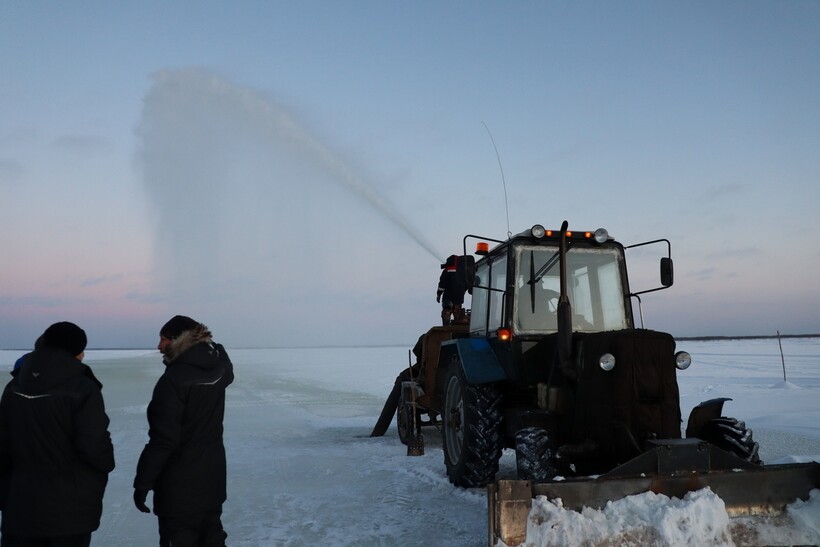 Когда водоем промерзает так сильно, на его поверхности строят полноценную трассу. Дорожники делают ее около трех недель. Здесь есть своя система полос, между которыми должно быть определенное расстояние. Двигаться по дороге нельзя быстрее 40 км/час. Для прочности по всей длине переправы выкладывают доски, которые заливают водой. Для этого в водоеме просверливают отверстия, чтобы вода поднялась наверх и покрыла будущую дорогу. Затем поверхность нужно разровнять.