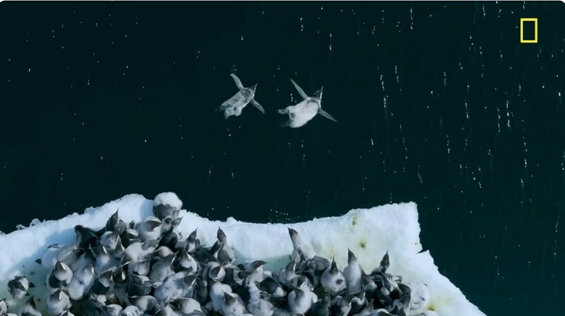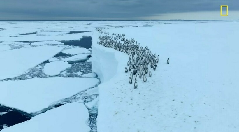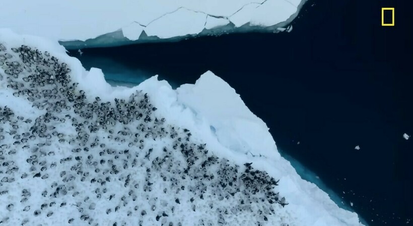 Птенцы находились на антарктическом утесе высотой 15 метров. На кадрах видно, как сотни птиц движутся прямо к берегу. Затем они столпились у края и стали ждать, когда самый смелый из них прыгнет в воду.