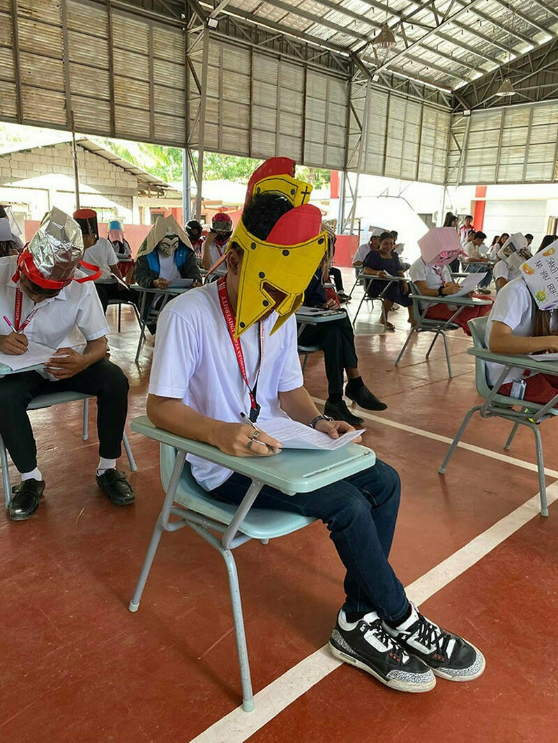 Есть несколько причин, по которым школьники и студенты списывают: они хотят получить хорошую оценку, боятся неудачи либо плохо подготовились к экзамену. Правда, не во всех учебных заведениях удастся списать. Вот тут мы рассказывали, в каких школах списать просто невозможно. Профессор из университета Филиппин Анджело Эбора (Angelo Ebora) придумал, кажется, самый небанальный способ борьбы с этим студенческим обманом: он предложил своим ученикам надеть смешные шляпы.
