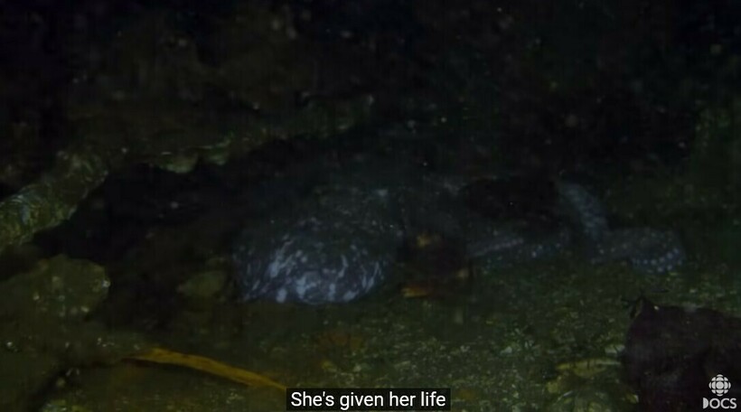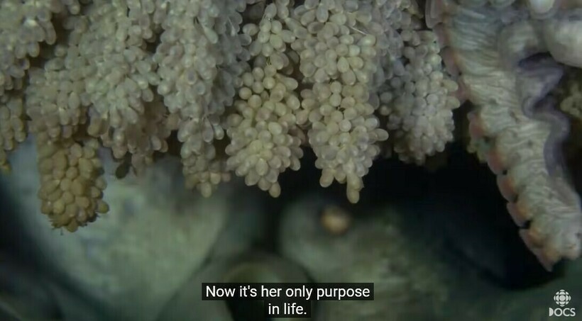 Самка никогда не покидает своих детенышей, она защищает яйца, обмахивает их, чтобы насытить кислородом, а также отгоняет от них вредные бактерии и водоросли. На самом деле, долгие месяцы защищая и выхаживая своих детей, мать медленно умирает от голода: она больше никогда не будет есть. Увядание отчетливо заметно на видео: сначала на теле осьминога появляется несколько белых пятен, а в конце ролика она становится практически серой. В финале самка уже близка к смерти, ей осталось дождаться, когда вылупятся детеныши, а затем медленно уйти из жизни.