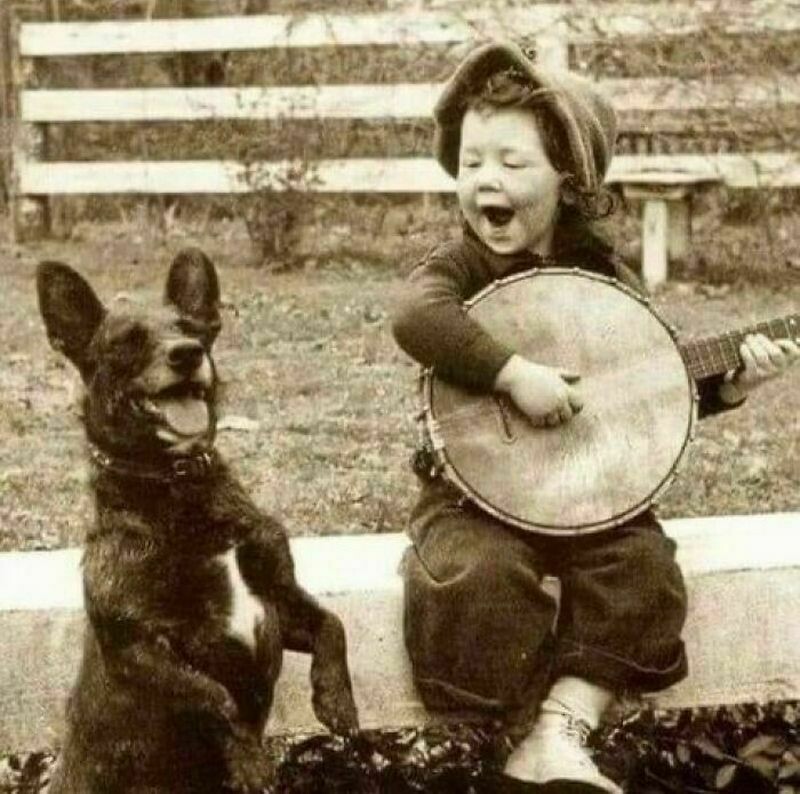 Мальчик играет на банджо со своим чудесным другом, 1920 гг.