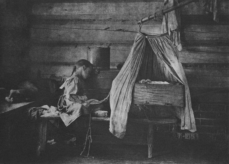 Девочка сидит возле люльки с младенцем, 1900 гг.