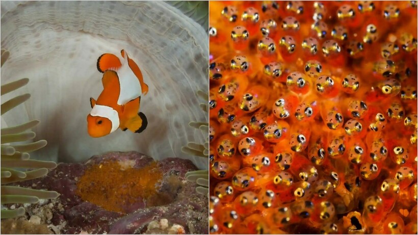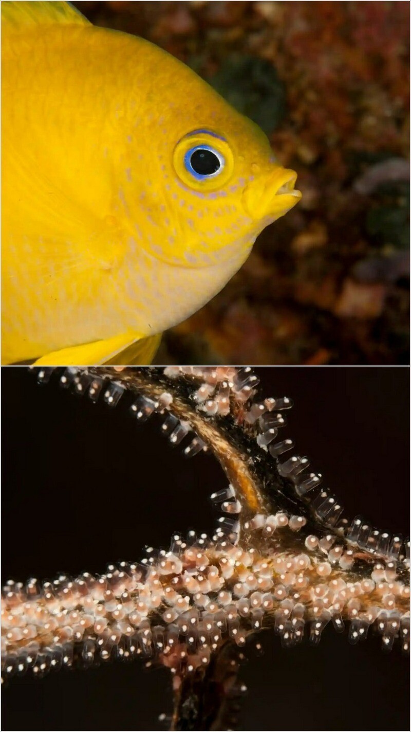 Самки лимонных амблиглифидодонов откладывают икру на кораллах, а самцы ее охраняют