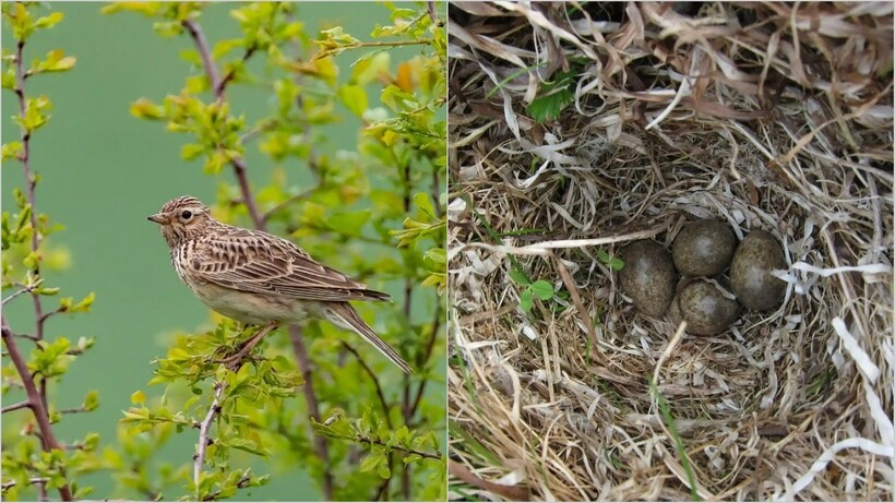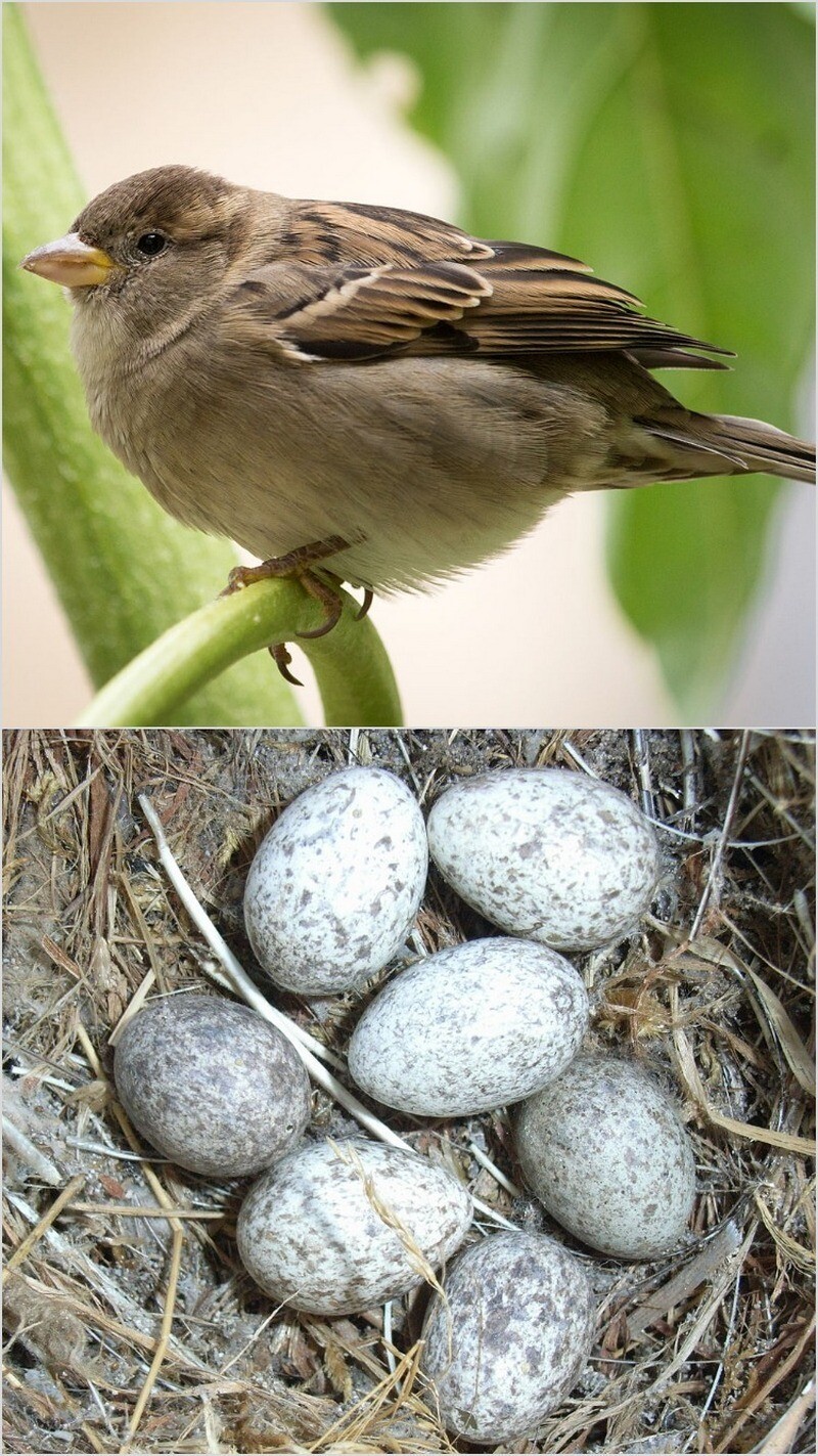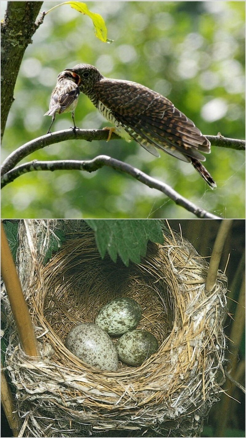 Кукушонок, которого кормит другая птичка, и яйцо кукушки в гнезде