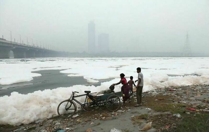 Река Ямуна в Нью-Дели: белое ― это не лед, а пена, которая появляется из-за сброса промышленных отходов в воду