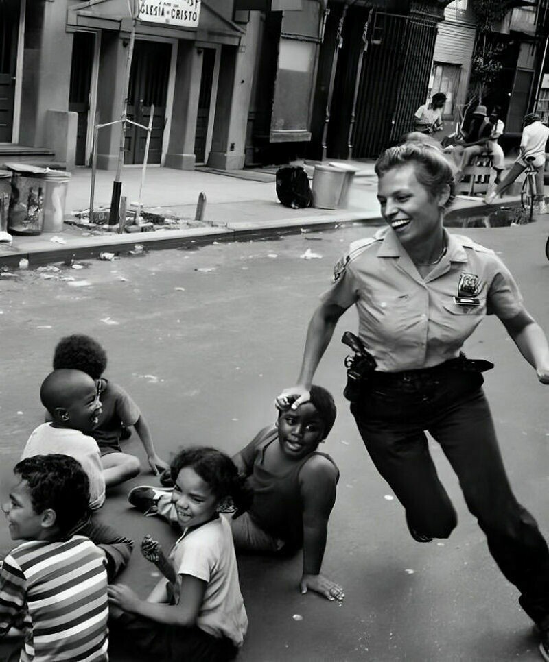Полицейский играет с детьми на улице Нью-Йорка, 1970