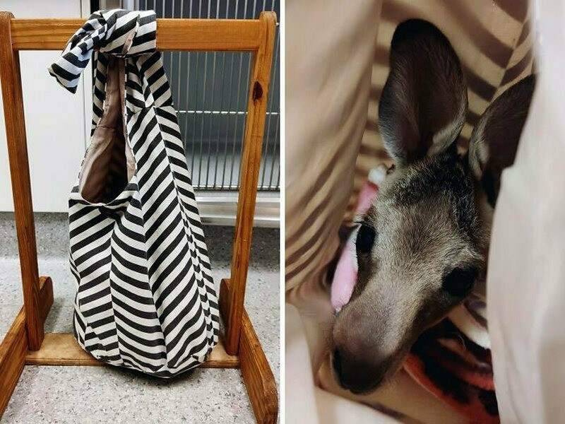 Детеныш кенгуру во время лечения в импровизированной сумке