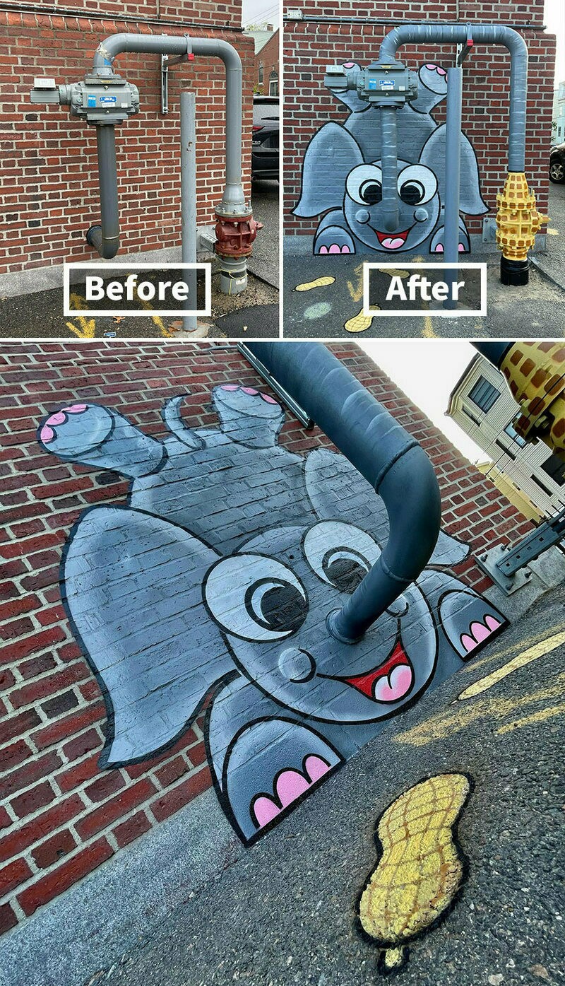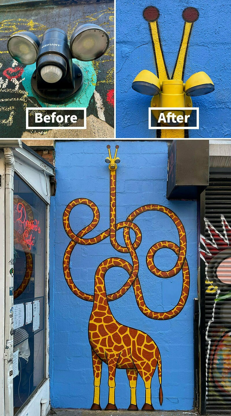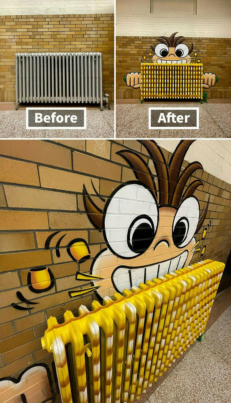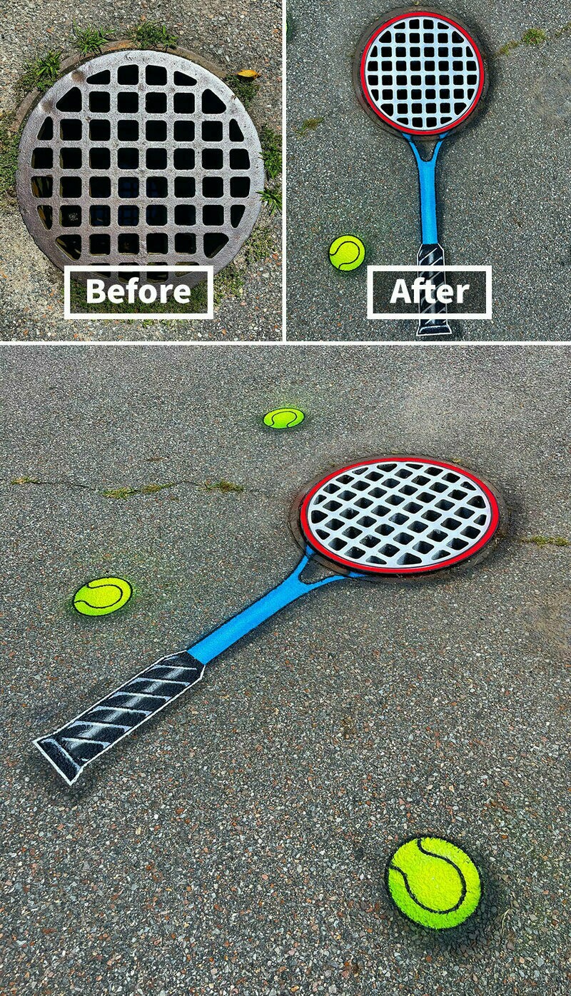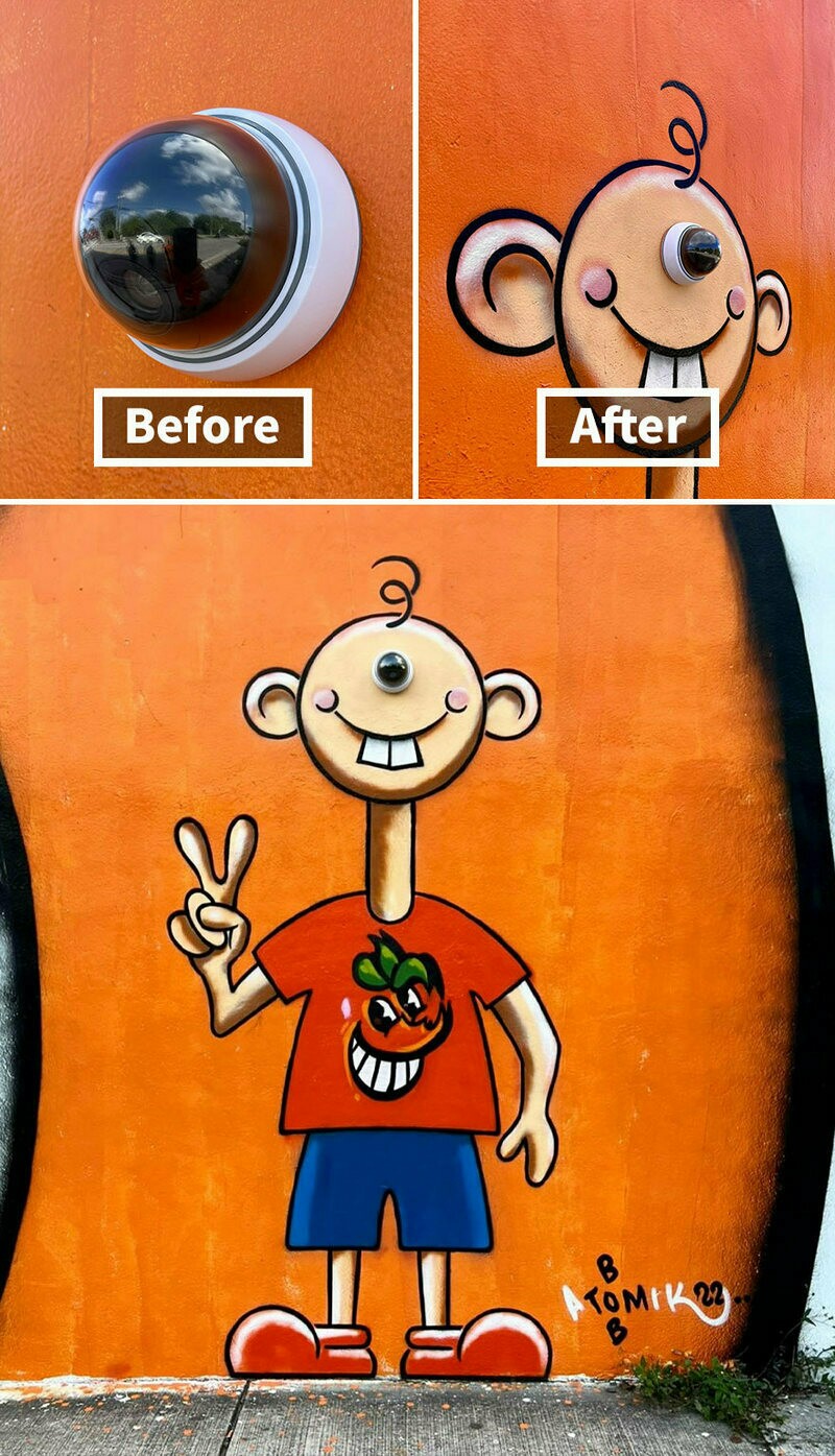 Граффити давно стали неотъемлемой частью улиц любого города. Иногда стрит-арт рисуют не только ради веселья или шутки, порой он становится заявлением: например, мы рассказывали, для чего Русское географическое общество сотрудничает с уличными художниками, которые по их заказу создают граффити. Но чаще всего стрит-арт превращает серые стены зданий, опоры мостов или какие-то старые заборы в яркие рисунки. Однако художник Том Боб пошел дальше: он отыскивает скучные детали в городе и оживляет их.