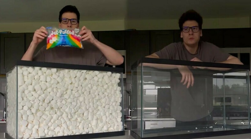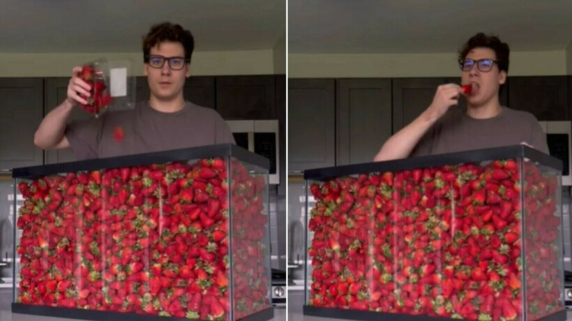 Тиктокер заполняет огромный аквариум разной едой и ест ее на камеру на протяжении долгого времени. С клубникой он управился за двенадцать часов.