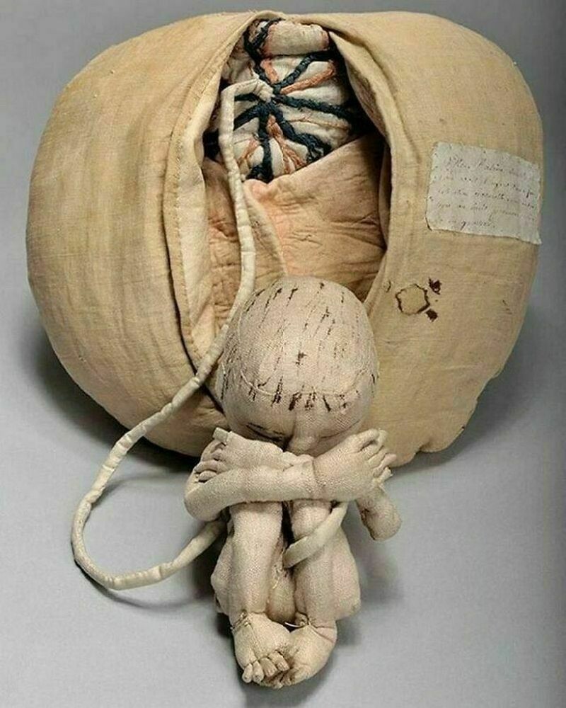 Тканевая матка XVIII века из Франции, на которой рассказывали, как проходят роды