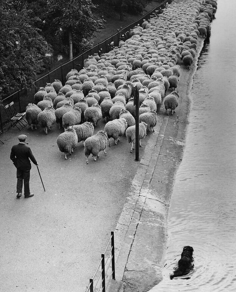 Пастух Гайд-Парка в Лондоне и его собака ведут овец на свежие пастбища, 1938