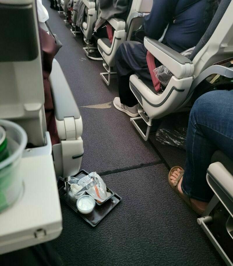 Пассажирка не стала дожидаться стюардессу и решила оставить поднос с посудой прямо в проходе