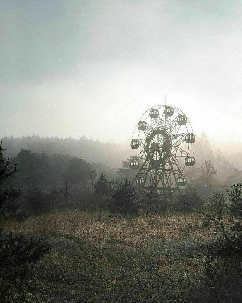 Утренний туман в заброшенном парке развлечений в Японии