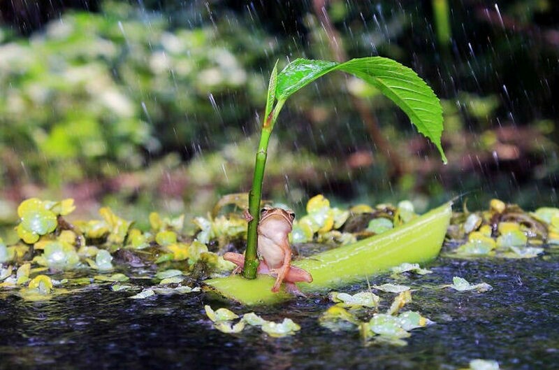 Лягушка спряталась от дождя