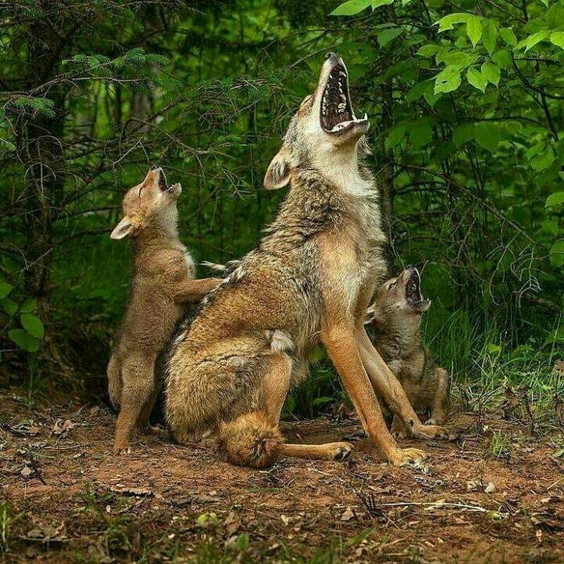 Мама-койот учит своих малышей выть