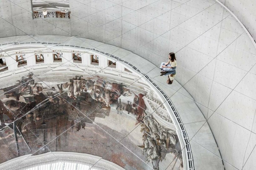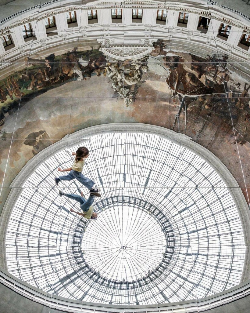 Художница просто покрыла пол одного из залов здания Парижской биржи, где проходит выставка, зеркальными панелями. Посетители делятся невероятными ощущениями, когда входят внутрь, ведь изысканный потолок ротонды, вся его лепнина отражается у них под ногами, и кажется, будто они парят.