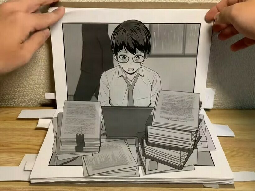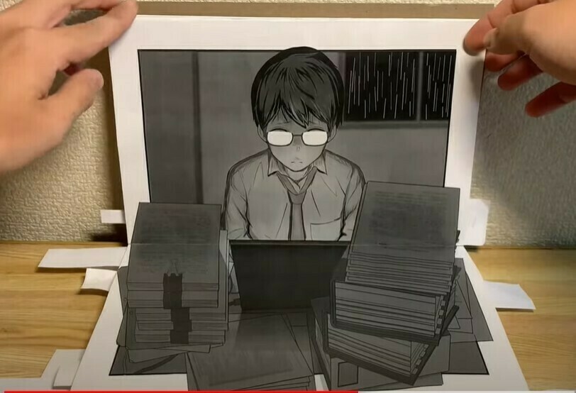 Японец создает потрясающие книги без слов, рисуя и вырезая множество деталей. Все в его альбомах создано вручную: от рабочего компьютера до улицы, на которой идет дождь. Сложные элементы в его работах двигаются и заставляют рисунки меняться. Герои на бумаге смеются, злятся, бегут и выражают эмоции.