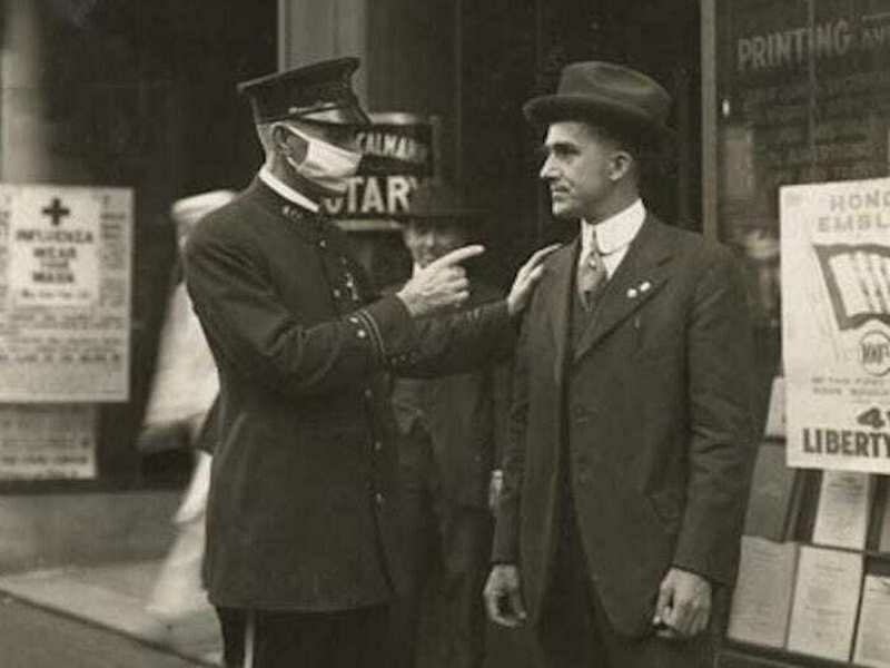 Полицейский остановил мужчину без маски на улице Сан-Франциско во время «испанки», 1918