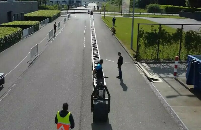 Четыре года команда собирала необычный транспорт, и работа оказалась успешной: монстр получился 55 метров в длину, размером с 4 автобуса. Управлять этим двухколесным конем должны двое: один человек должен сидеть сзади, а другой ― за рулем. Посмотрите, как выглядит такая поездка.