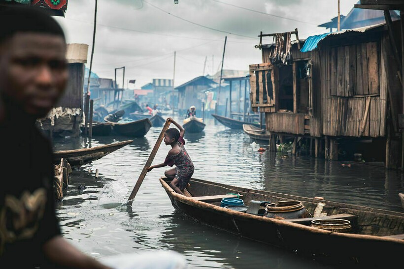 Ребенок по дороге в школу в трущобах Лагоса в Нигерии, где дома стоят на воде