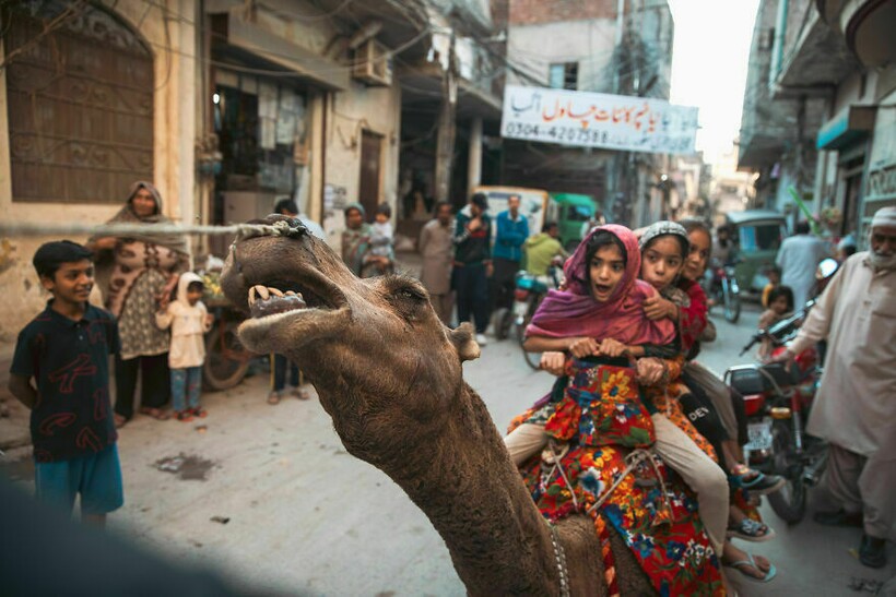 Дети катаются на верблюде на улице пакистанского города Лахор