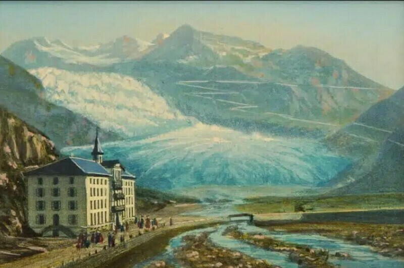 Как и сейчас, полтора столетия назад Ронский ледник был популярной достопримечательностью. Прямо возле него стоял отель, в котором отдыхали многие знаменитости, в том числе и Папа Римский. Мы рассказывали, что он закрылся, так как ледник от гостиницы отступил очень далеко.