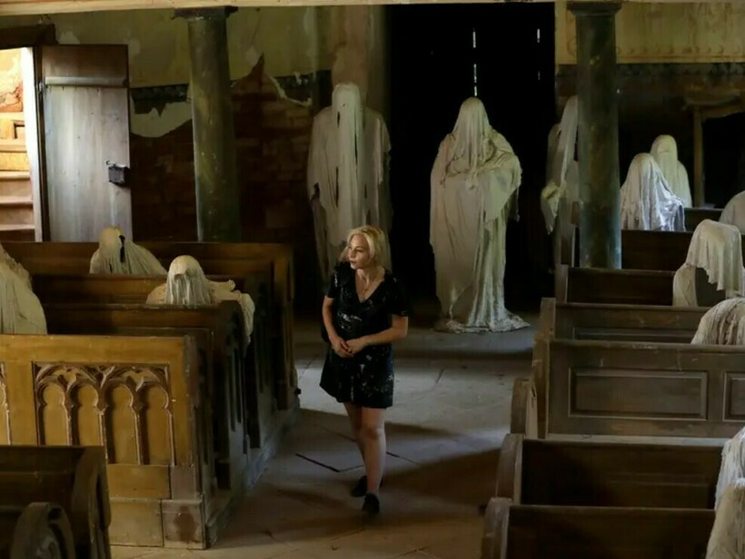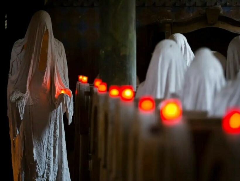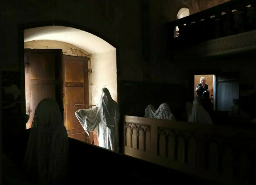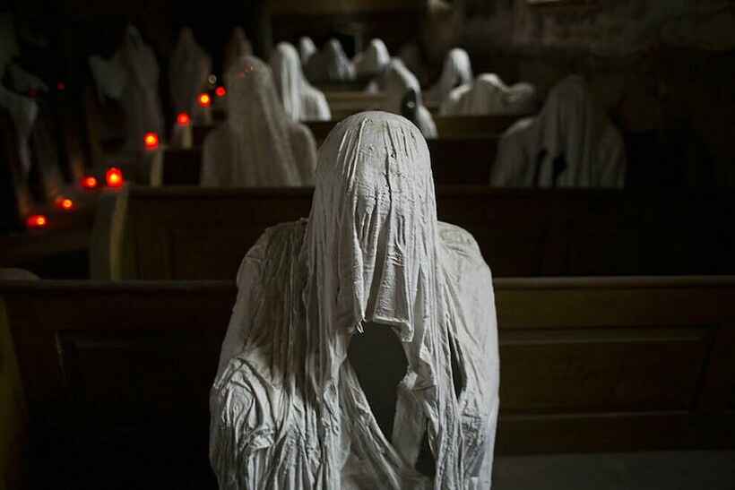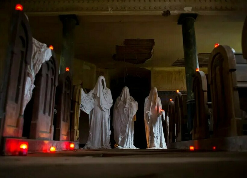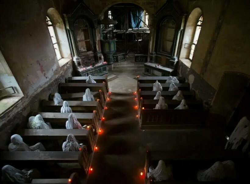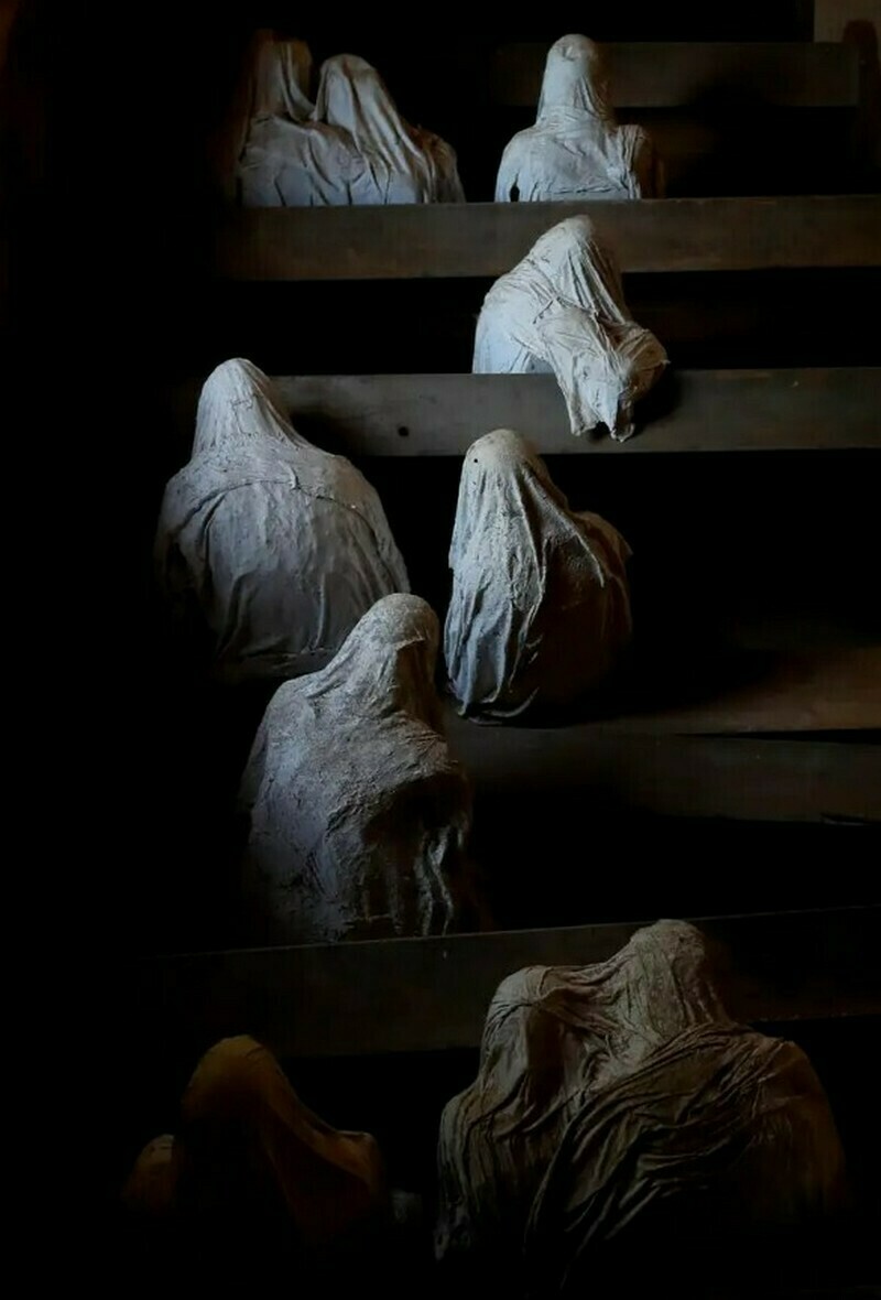 На первый взгляд кажется, будто прихожане в платках пришли на утреннюю службу. Они сидят на скамьях, стоят у входа и находятся по всей территории храма, придавая ему жуткую атмосферу.