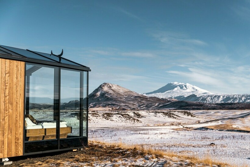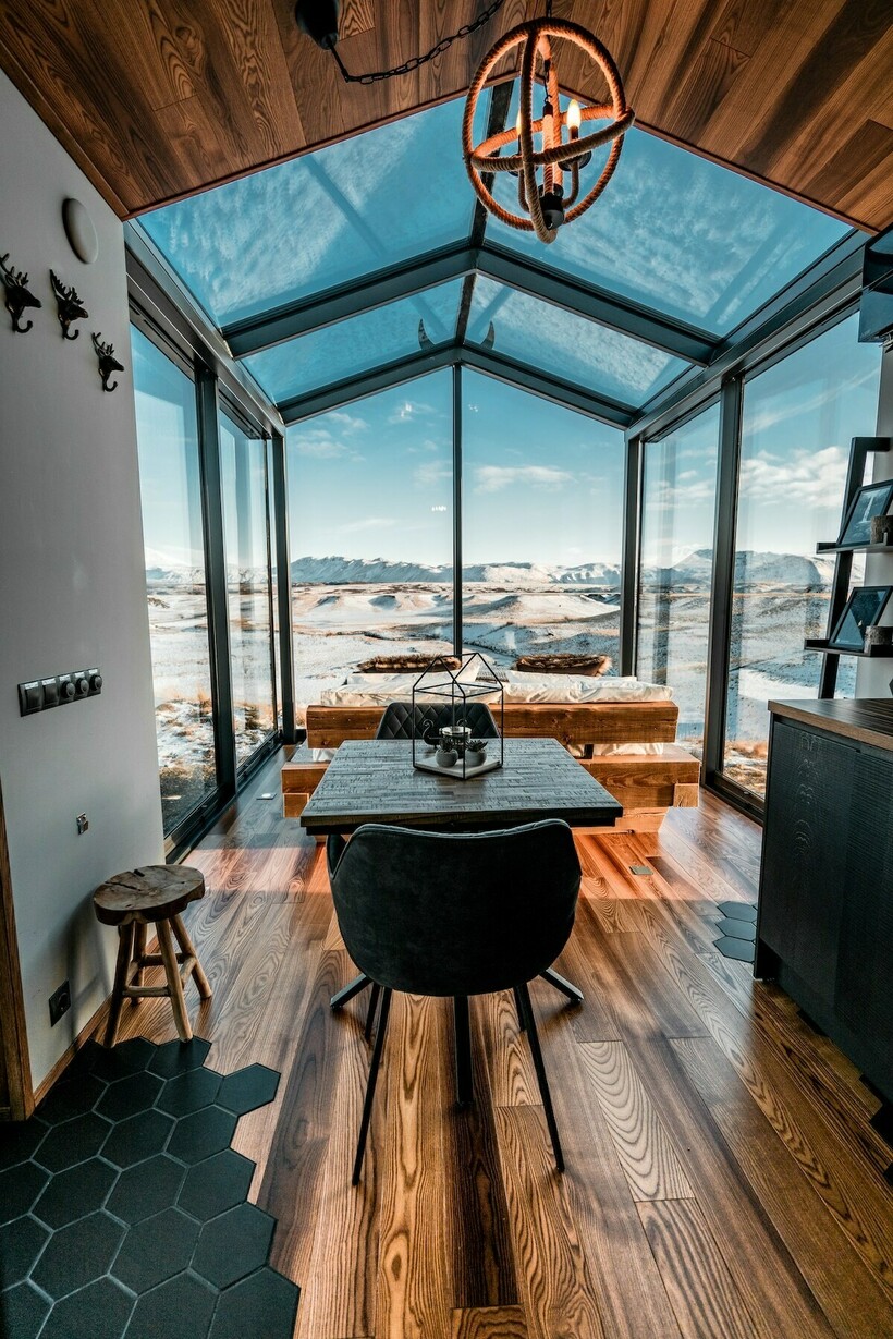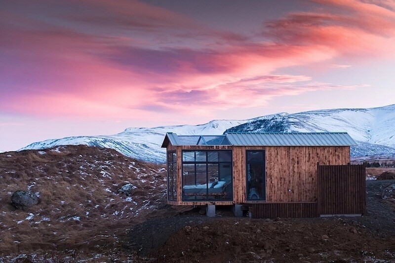 Исландия ― одна из тех стран, где можно любоваться северным сиянием больше ста дней в году. Сезон охоты за авророй здесь начинается с сентября, и увидеть чудесные краски неба можно вплоть до середины апреля. Самый популярный способ его увидеть ― отправиться на машине за город. Однако есть и более интимный вариант: переночевать в долине прямо под ночным небом. Одно из таких мест, отлично подходящее для ночевки, находится недалеко от Рейкьявика ― это отель Panorama Glass Lodge.