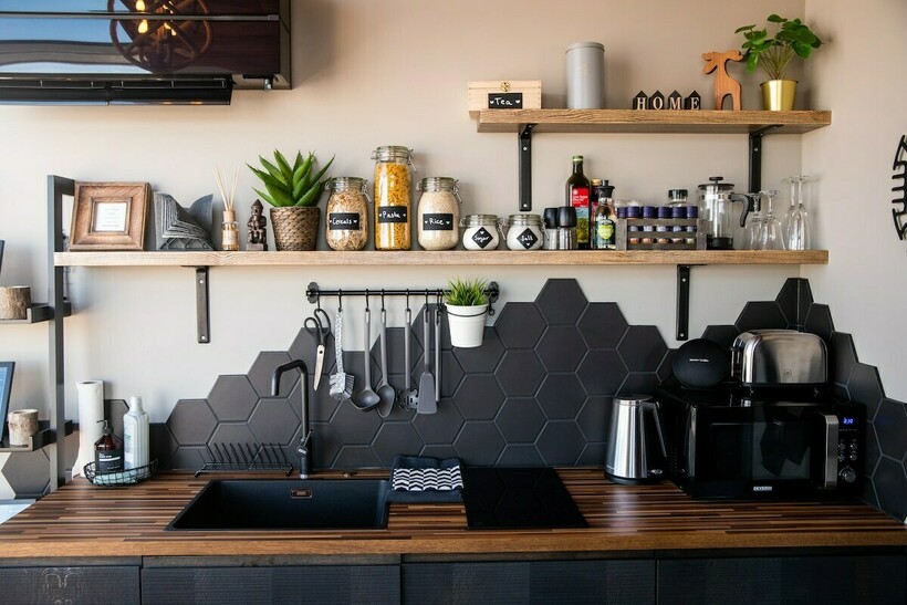 В закрытой зоне расположена кухонная мебель, а также ванна