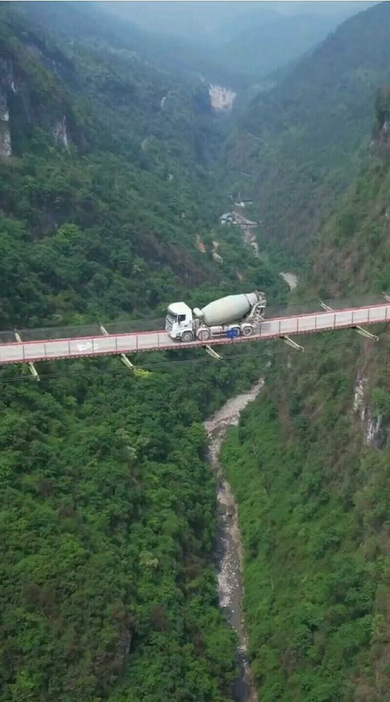 Подвесной мост через реку Дадун в Чунцине, вероятно, самый страшный мост в мире. Видеоролики, как по нему передвигаются грузовые автомобили, недавно стали вирусными в соцсетях. Мост на самом деле вызывает шок: он соединяет два берега реки Дадун и висит прямо над ущельем на трехсотметровой высоте.