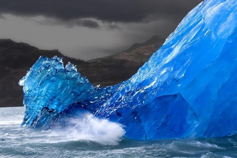 Ледяная гора, отломившись от ледника, с гулом падает в воду и переворачивается. При этом повороте можно наблюдать уникальное зрелище: темно-синее основание айсберга.
