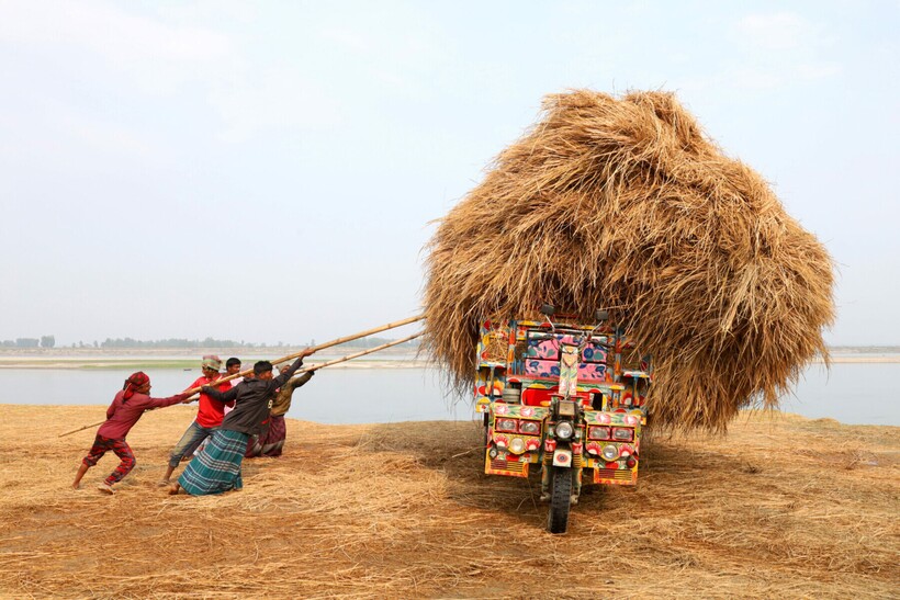 Бангладешские фермеры грузят рисовую солому, которая пойдет на корм животным
