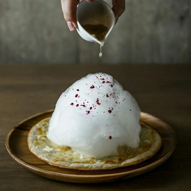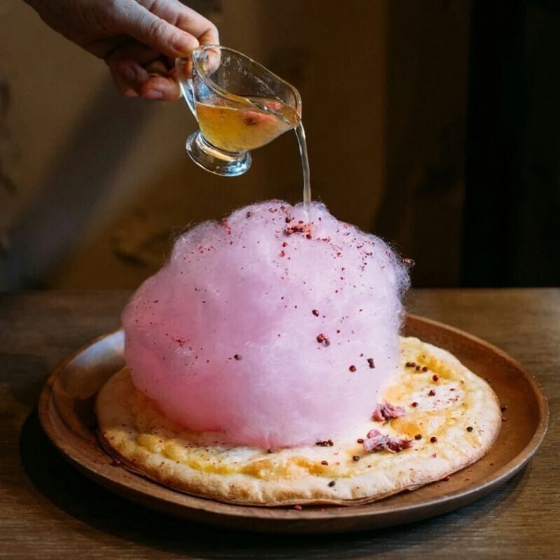 Некоторые гости ресторана Schmatz Beer Dining в Токио думают, что перед ними десерт в виде пиццы, но это ошибка. Это самая настоящая пицца на стандартном тесте, в составе которой есть и привычный сыр. Однако вместо пеперони, грибов и спелых томатов сверху на сыр выкладывают самый необычный ингредиент ― облако сахарной ваты. Ее поливают медово-имбирным соусом, отчего вата тает прямо на глазах, и тесто с сыром пропитывается ее сладостью.