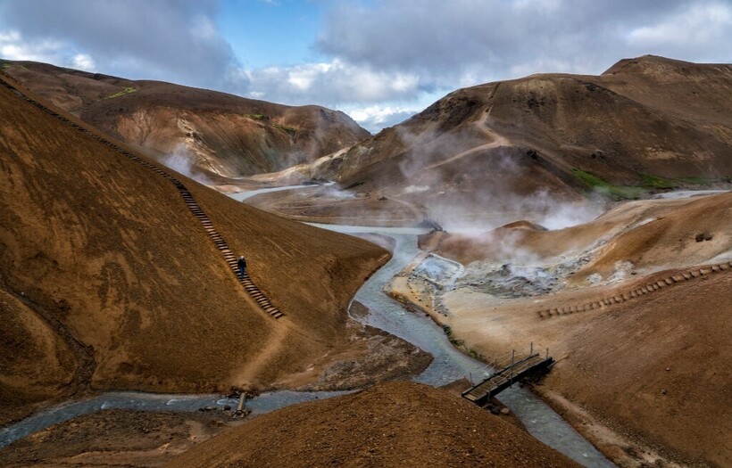 Долина гейзеров Хверадалир с горячими источниками, озерами с кипящей грязью и цветными горами
