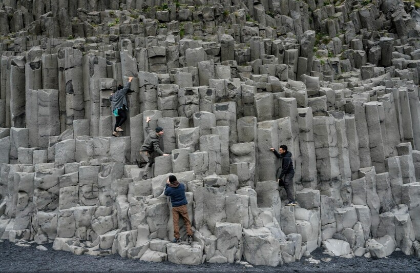 Туристы фотографируют знаменитые базальтовые колонны на пляже Рейнисфьяра