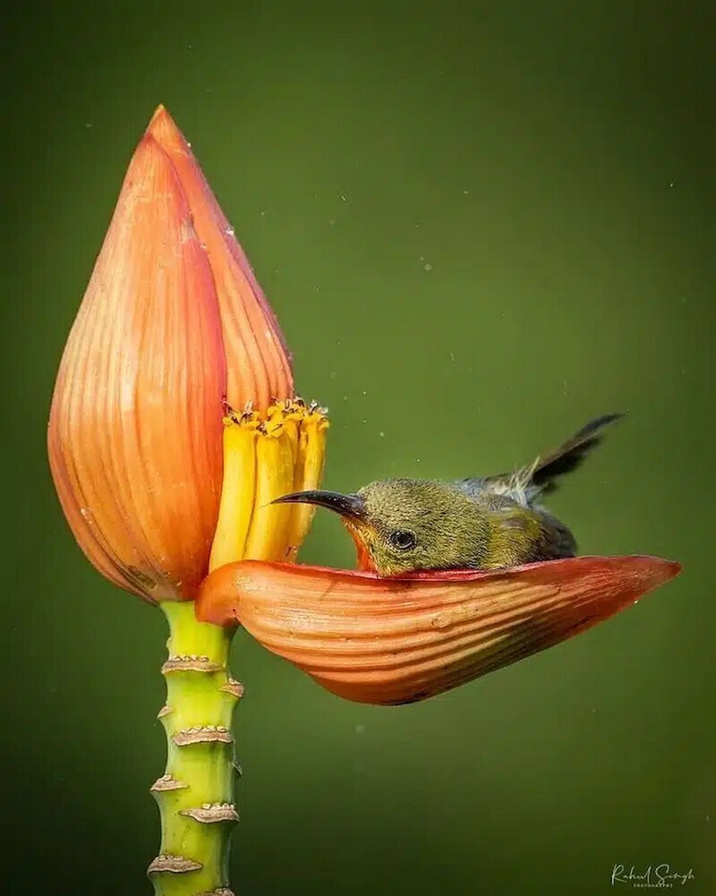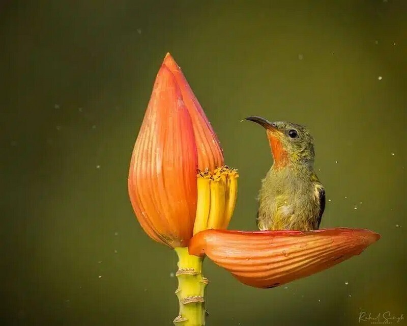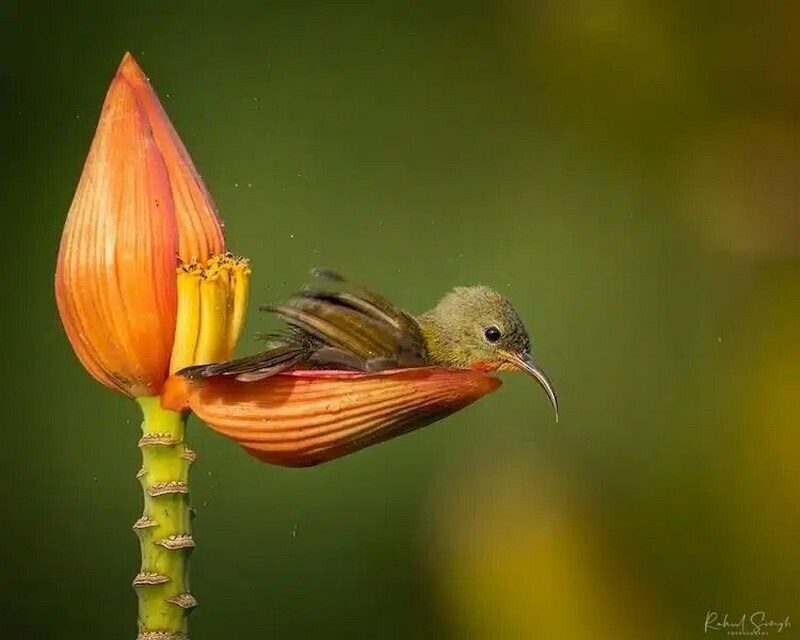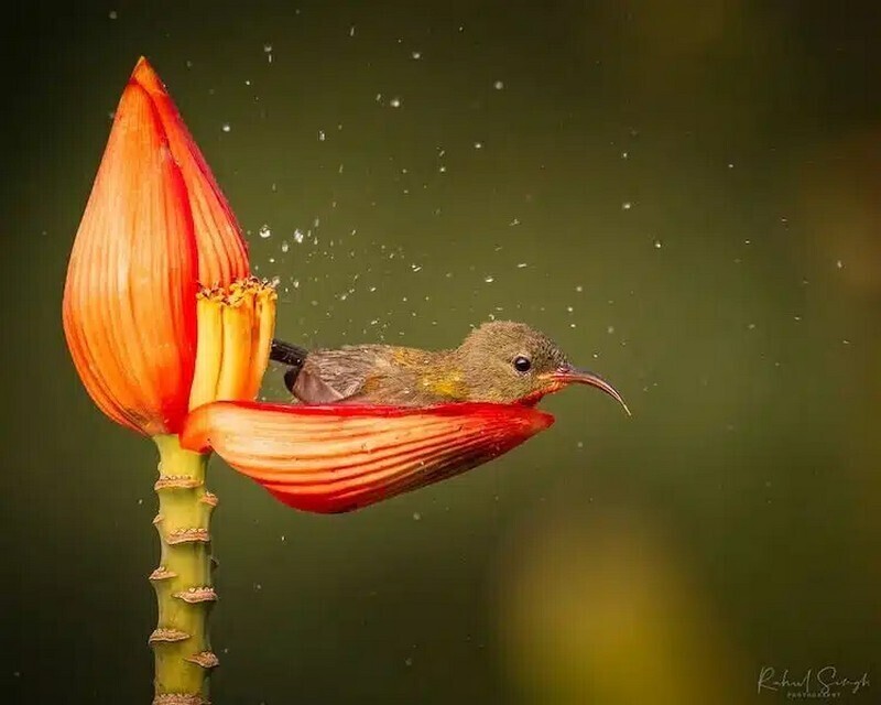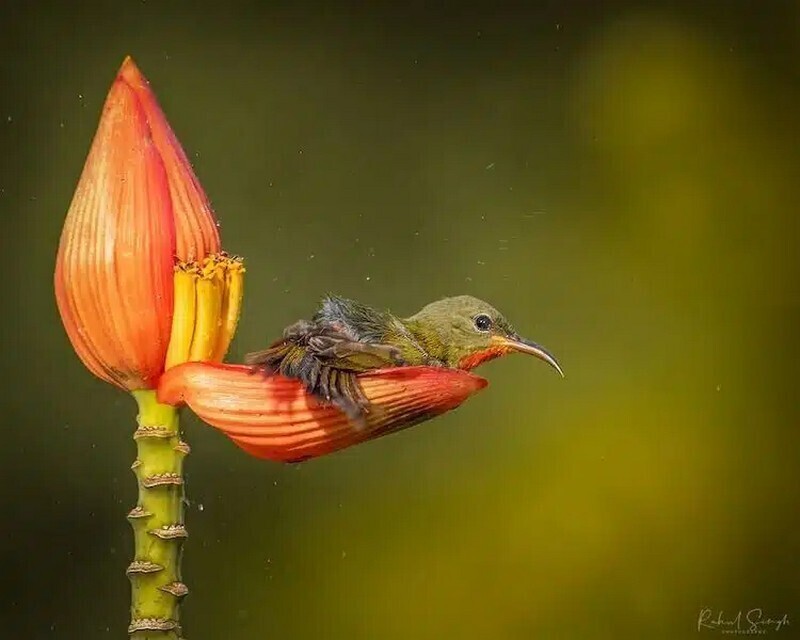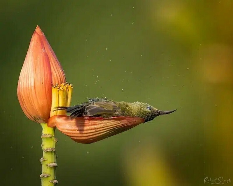 Нектарницевые ― это семейство крохотных птичек, которые обитают в тропических поясах Африки, Евразии и Австралии. Их можно назвать двоюродными сестрами колибри: по сути, они выполняют ту же функцию в Восточном полушарии, что и колибри ― в Западном. У них тонкий клюв, а размер обычно не более 15 сантиметров. Птички добывают нектар из цветка, забираясь внутрь, а иногда разламывая его своим клювом. Фотограф Рахул Сингх из Индии увлечен птицами, и недавно он стал свидетелем совершенно сказочного действия: маленькая нектарница купалась в банановом листке. Конечно, он поспешил запечатлеть эти удивительные водные процедуры.