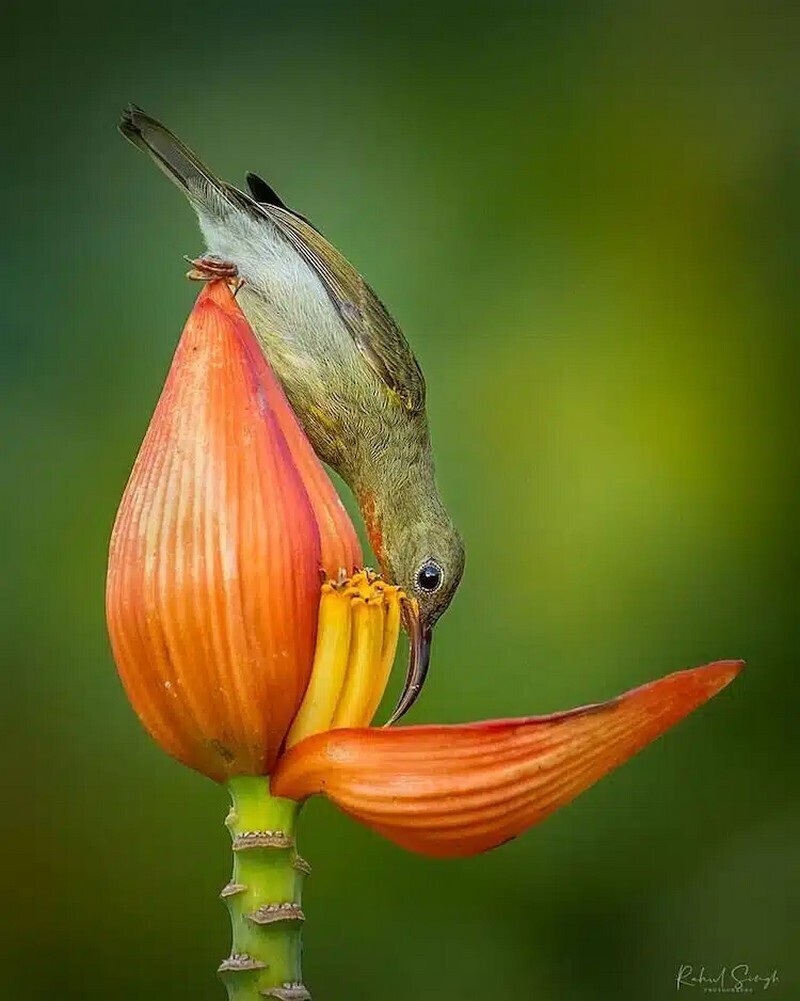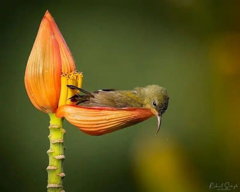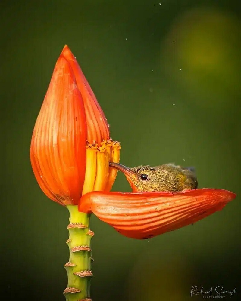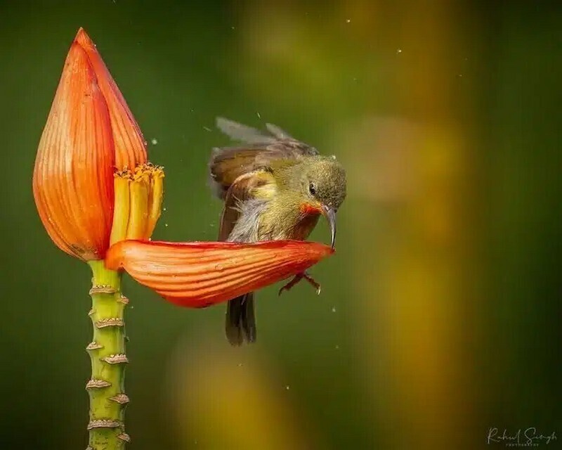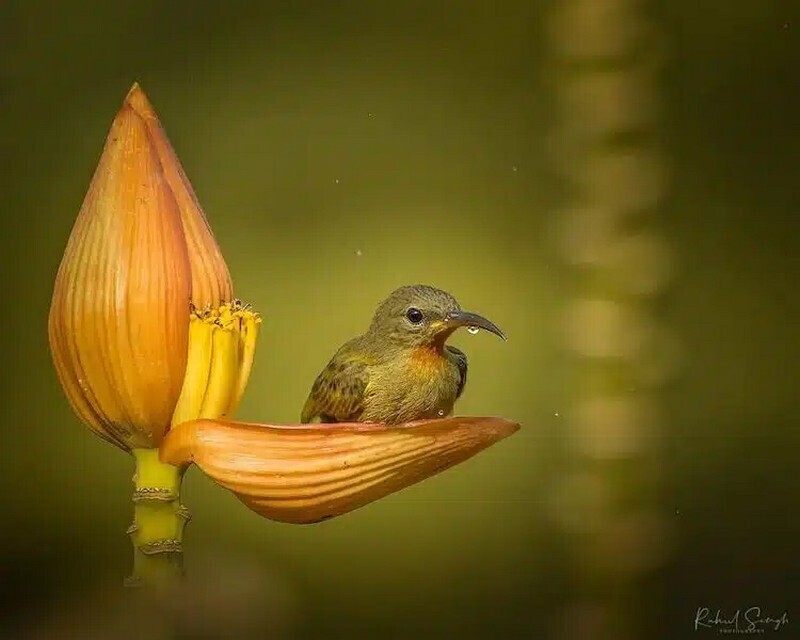 Нектарницевые ― это семейство крохотных птичек, которые обитают в тропических поясах Африки, Евразии и Австралии. Их можно назвать двоюродными сестрами колибри: по сути, они выполняют ту же функцию в Восточном полушарии, что и колибри ― в Западном. У них тонкий клюв, а размер обычно не более 15 сантиметров. Птички добывают нектар из цветка, забираясь внутрь, а иногда разламывая его своим клювом. Фотограф Рахул Сингх из Индии увлечен птицами, и недавно он стал свидетелем совершенно сказочного действия: маленькая нектарница купалась в банановом листке. Конечно, он поспешил запечатлеть эти удивительные водные процедуры.