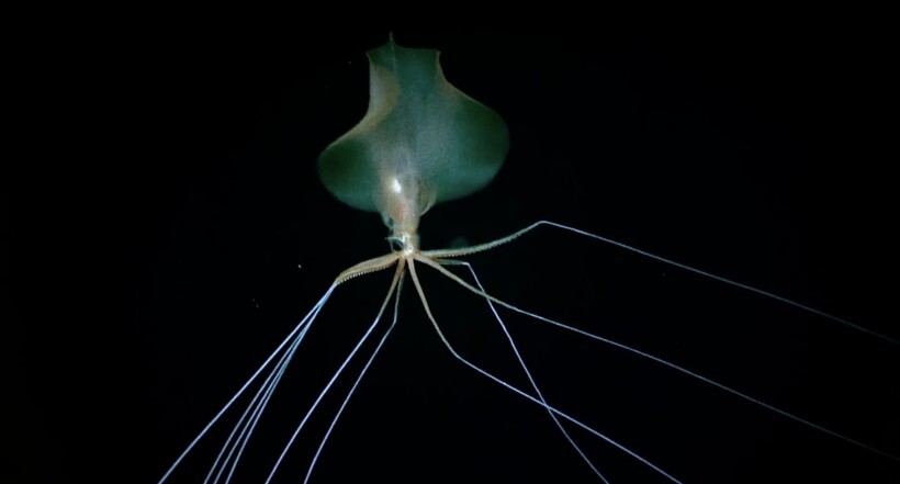 На кадрах кальмар Magnapinna, о котором очень мало сведений. Впервые его описали в 1907 году, однако с того самого момента этого кальмара видели не больше двадцати раз. Ролик снят на глубине 3300 метров, а вообще эти гиганты могут опускаться еще глубже: до шести километров.