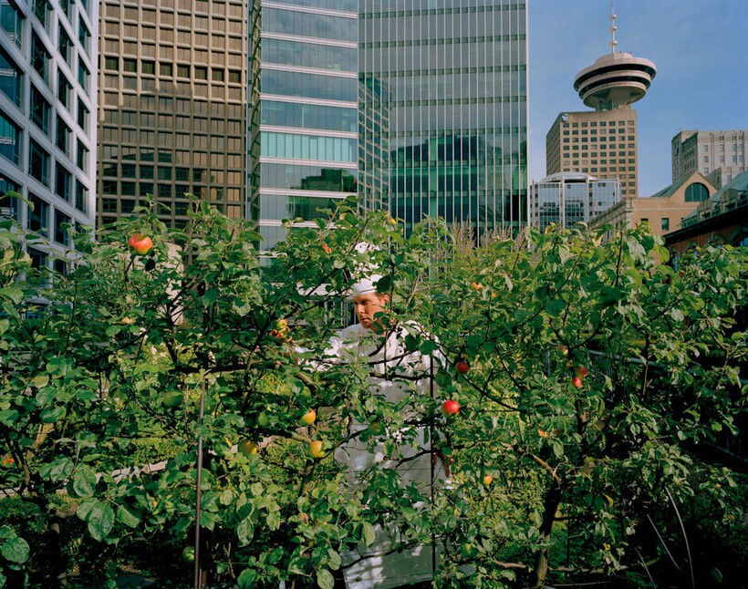 Крыша отеля в Ванкувере, Канада: повар собирает яблоки и зелень для ресторана