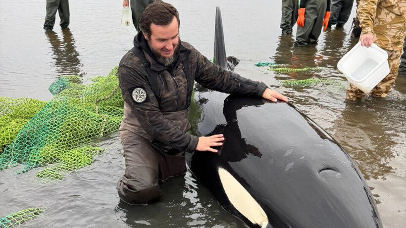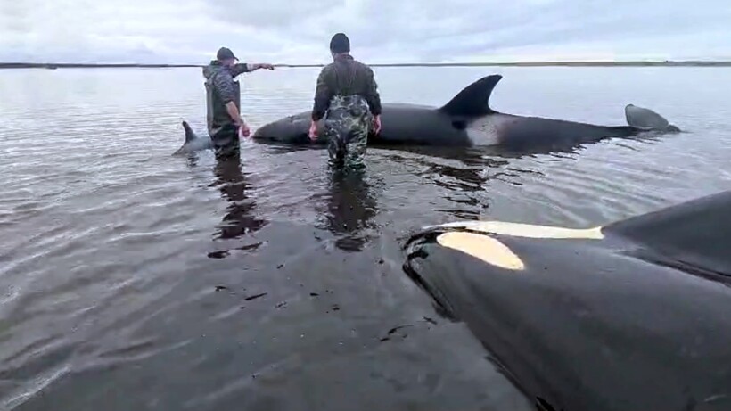 На берегу Охотского моря рядом с селом Устьево несколько дней назад в западне оказалась семья косаток: отлив был сильным и резким, из-за чего киты сели на мель. В ловушку попали два взросых кита и два детеныша. Им на помощь пришли сотрудники МЧС и волонтеры.