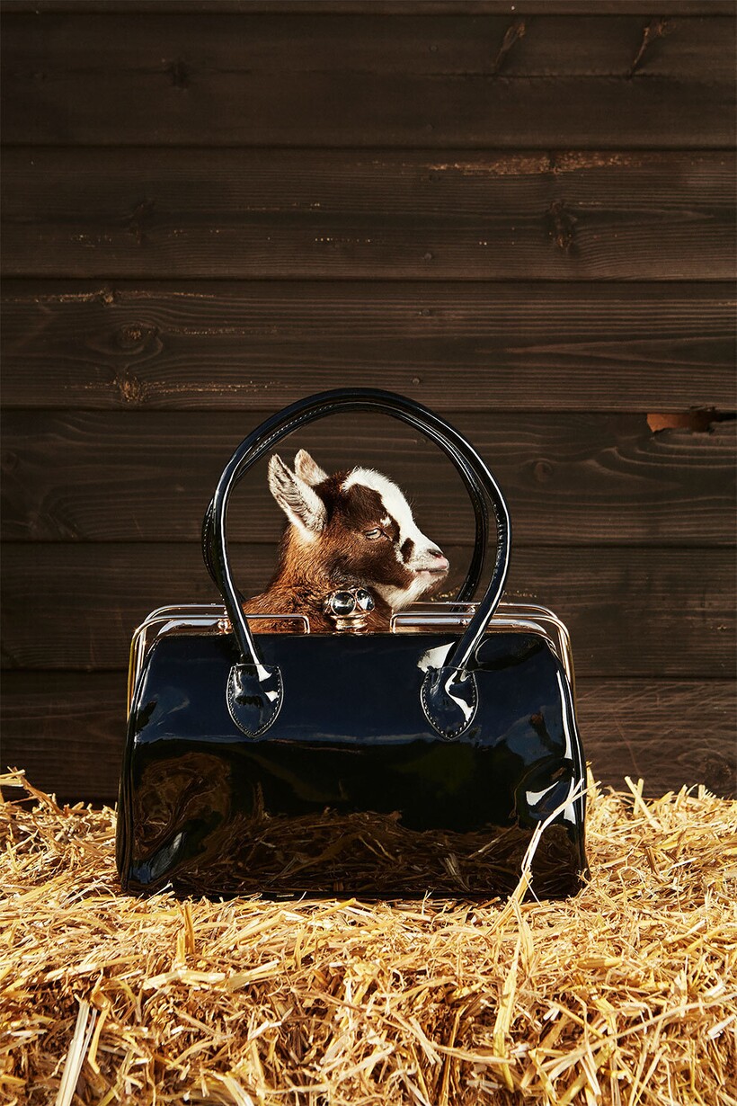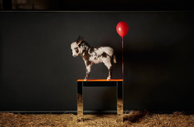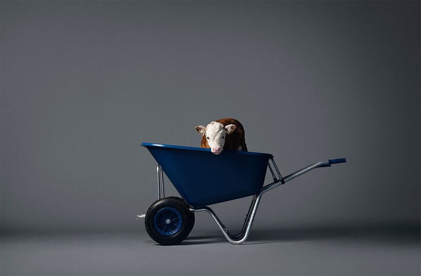 Миниатюрный герефордский бычок, кажется, не особо доволен тележкой