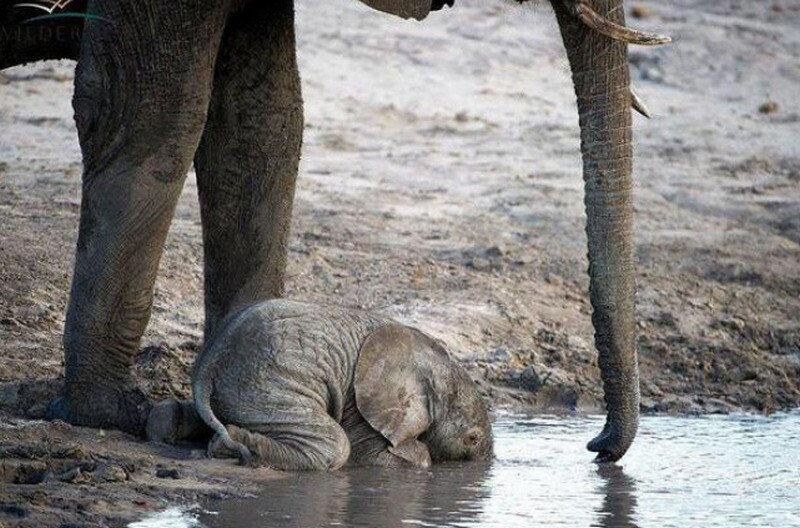Слонята в первые месяцы не умеют пользоваться хоботом, поэтому они пьют воду в такой позе