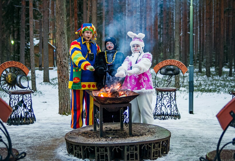 Помощники Деда Мороза греются у костра, возможно, волшебного